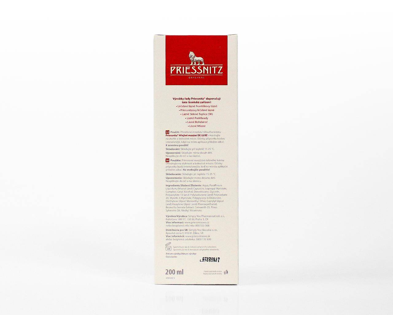 Priessnitzovo hřejivé mazání DeLuxe bylo vyvinuto dle nejnovějších poznatků moderní farmacie. Přípravek obsahuje unikátní složení obsahující směs éterických a aromatických složek, především kafr a kapsaicin.
